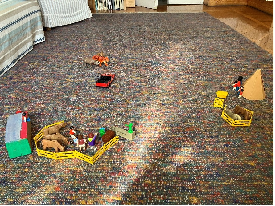 Al di là della immediata, facile traduzione simbolica dei contenuti che ho proposto, quello che mi preme sottolineare è il valore del gioco condiviso che permette alla bambina di poter esprimere una gamma di emozioni/pensieri, dal desiderio/bisogno di intimità e vicinanza, trasformazione della rigida necessità della separatezza che apre invece la seduta, ai temi aggressivi-distruttivi degli incontri con gli animali selvaggi.